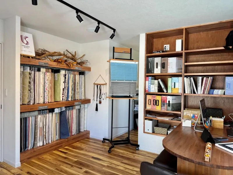 まずはご来店。お気に⼊りのカーテンを選びましょう。ご来店の際は、事前にお電話またはLINEにてご予約いただけますとスムーズにご案内できます。